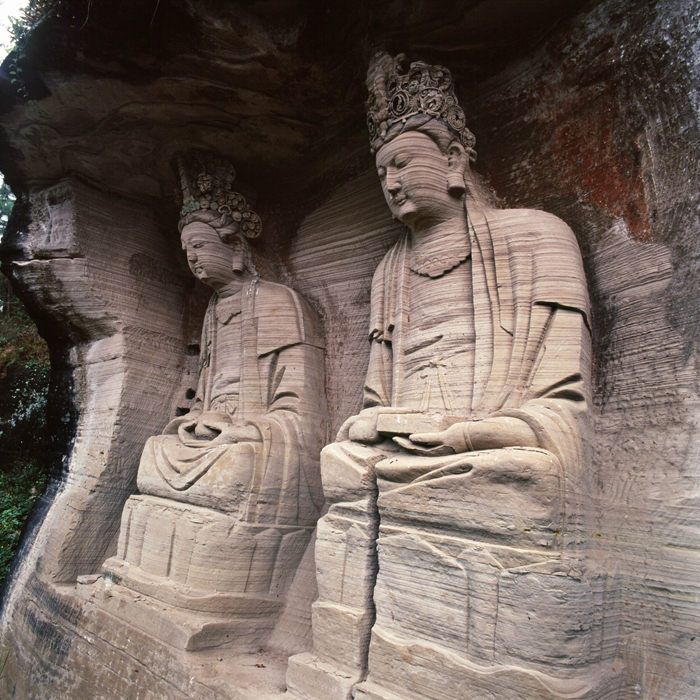 观音菩萨、大势至菩萨和文殊师利菩萨(图四)高5至8米。观音菩萨左手前伸,平托纱巾;大势至菩萨左手内曲置于胸前,五指并拢平托厚厚经卷。文殊师利菩萨,左手托书外伸达1.5米,书和手重量超千斤,仅以高2.2米的垂地袈裟支撑,千年不毁,是古代匠师巧妙运用力学的佳作,体现了中国古代雕塑艺术与科学技术的完美结合。后岩壁上的护法神龛内造像呈半圆形,集中雕塑均高1.8米的十二个护法神(图五),皆甲胄鲜明,其手或提九仗剑,或执便托杵;其头或昂扬猛呼,或怒目扭颈;有的剖腹见心,有的捏拳定神,虎视眈眈,威猛剽悍,真心睃寻法场,虔诚拱卫佛士。茗山寺南山头上有一转**塔。四方五层。各层皆有圆龛佛像,第一层四面皆刻卷曲发像。有题刻“佛日增辉,**常转,风调雨顺,国泰民安。”