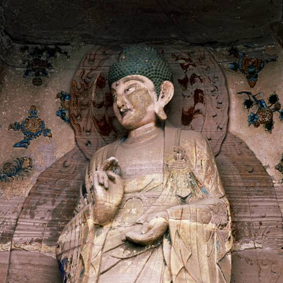 景区内石刻艺术扣人心弦,北岩的石刻造像,题材以观音、释迦牟尼为主,其特点是开大窟造大像。以“西方三圣”最为壮观,分别刻造于三大龛中。三像高均在7米左右,面目俊俏,体姿放逸,比例协调,装饰繁华。正中为阿弥陀佛(图三),满头螺髻,身披袈裟,手着法指,神态威严,大有佛法无边,威德慑众的佛教鼻祖风度。左为观音菩萨,头戴花冠,身披璎珞,左手提净瓶,右手拈柳枝,赤足踏莲花,大有悲天悯人之态。右为莲花手观音(图二),面容慈祥,神态自如,大有唯我独具慧光普照一切之感。打破了中国早期石窟造像中佛、菩萨一律端庄、严肃,正襟危坐的造像仪轨,使他们走出了虚幻的殿堂,佛和菩萨世俗化、人性化,把石刻艺术推向了顶峰,达到了登峰造极的艺术效果。
