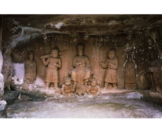 南岩的五代造像题材多达27种,首次出现了“十六罗汉”、“毗沙门天王”(图五)、“地狱经变龛”(图六)、“地藏菩萨与十王变”等新内容。其造像小巧玲珑,神情潇洒,衣饰简练,衣纹细密,薄衣似帛,既带有唐代的丰厚、典雅,又具有宋代的俊美、华丽。明王龛,千手观音龛,地藏菩萨、十王变龛、罗汉龛、北方毗沙门天王龛等,帔巾凸起高出体表,甲片鱼鳞片片可数。这种精致细腻的雕刻手法,是中国民间雕塑民族化的成功表现。景区内绿树环绕其间,自然、人文景观赏心悦目。唐代的舍利塔,古朴庄重。宋代伟大的数学家秦九韶纪念馆建造宏伟,气势雄浑。