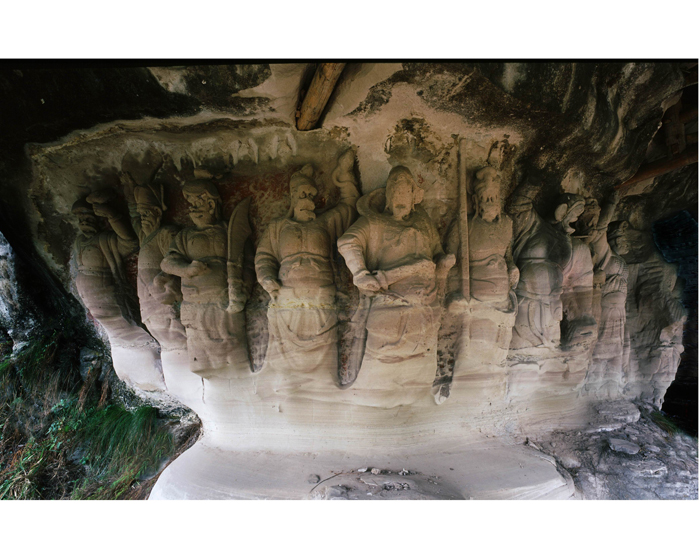 观音菩萨、大势至菩萨和文殊师利菩萨(图四)高5至8米。观音菩萨左手前伸,平托纱巾;大势至菩萨左手内曲置于胸前,五指并拢平托厚厚经卷。文殊师利菩萨,左手托书外伸达1.5米,书和手重量超千斤,仅以高2.2米的垂地袈裟支撑,千年不毁,是古代匠师巧妙运用力学的佳作,体现了中国古代雕塑艺术与科学技术的完美结合。后岩壁上的护法神龛内造像呈半圆形,集中雕塑均高1.8米的十二个护法神(图五),皆甲胄鲜明,其手或提九仗剑,或执便托杵;其头或昂扬猛呼,或怒目扭颈;有的剖腹见心,有的捏拳定神,虎视眈眈,威猛剽悍,真心睃寻法场,虔诚拱卫佛士。茗山寺南山头上有一转**塔。四方五层。各层皆有圆龛佛像,第一层四面皆刻卷曲发像。有题刻“佛日增辉,**常转,风调雨顺,国泰民安。”